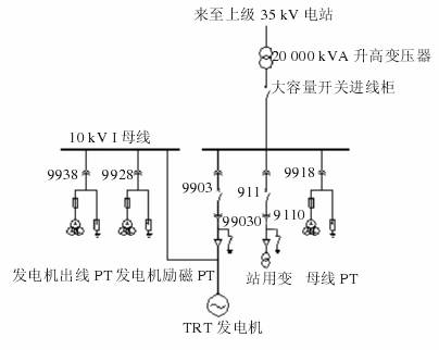 重钢新区TRT系统高压一次接线系统图见图1。1台发电机出线PT柜;1台励磁用PT柜;1台发电机并网柜;1台母线PT柜;1台站用变压器柜;1台大容量开关进线柜;1台站用变压器(630kVA);1台升压变压器(35/10.5kV)。