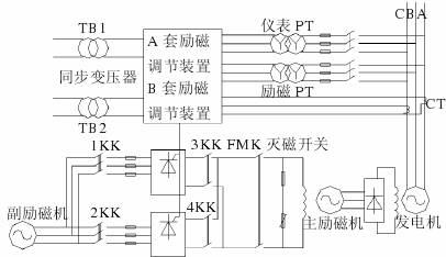 TRT发电机励磁系统采用交流励磁机旋转硅整流器励磁,即三机(无刷)励磁系统。三机励磁系统由发电机、旋转整流二级管装置、主励磁机、副励磁机、励磁控制器、可控整流桥、灭磁开关等构成,见图2。发电机励磁电流由同轴的交流励磁机经硅整流二极管供给,交流励磁机的励磁电流由同轴的永磁式副励磁机经可控整流装置供给。副励磁机采用永磁式同步发电机,随着主机运行参数的变化,励磁调节控制器自动地改变交流励磁机励磁回路中可控整流装置的控制角,以改变交流励磁机的磁场电流,从而改变交流励磁机的输出电压,最终达到调节发电机励磁电流的目的。