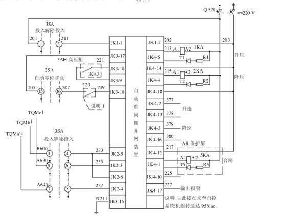 发电机自动并网装置见图3。TQMb、TQMo;TQMa'、TQMb分别为待并侧和系统侧TV二次电压(TQMb公共接地),用于获取并网信息。3SA为自动同期投入开关,2SA为手/自动同期选择开关。JK3-9及JK3-10接入并列点断路器的辅助接点(常开),其用途有:①用来实测断路器合闸回路动作时间;②用来确认线路是在切除还是投入状态。在用于多对象时各并列点断路器辅助接点通过各自的同期开关或选线器接到装置的JK3-9及JK3-10上。JK3-18为同期装置开关量输入,即2SA选择自动位,透平机转速达到2850r/min时,通过该装置的JK4-3、JK4-16及JK4-2、JK4-13控制量输出给PLC系统发出“升速”、“降速”脉冲信号来自动调节转速:当PLC系统按下“电气控制转速”按钮后,PLC控制系统每次接受到准同期并网装置发送的“升速”、“降速”信号时,透平机转速设定值增、减0.5r/s。使发电机电压频率f向系统电压频率f1看齐。