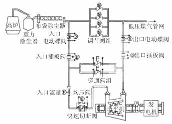 TRT发电机工艺图见图4。高炉产生的煤气,经重力干法除尘器,进入TRT装置。经入口电动碟阀,入口插板阀,快切阀,经透平机膨胀作功,带动发电机发电,自透平机出来的煤气,进入低压管网,与煤气系统中减压四阀组(液压快开阀)并联。