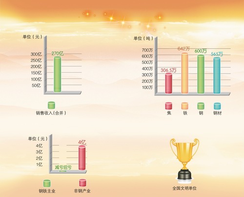 重钢集团公布2014年主要目标,计划实现销售收入270亿元,生铁产量642万吨、粗钢产量600万吨、钢材产量565万吨、焦炭产量306.5万吨。