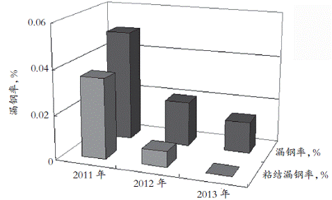 2013年下半年后已经实现300万t无漏钢,17个月以上未发生粘结漏钢。2011年后漏钢发生率变化如图1所示。