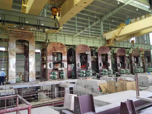 △2250热轧精轧牌坊“七兄弟”大团圆5月14日,2250热轧精轧F1牌坊开始吊装。随着行车指吊员一声令下,两台主轧跨行车钢丝绳缓缓落下,F1牌坊平稳落在底座上。至此,7台精轧机F1-F7七个机架牌坊全部安装到位。