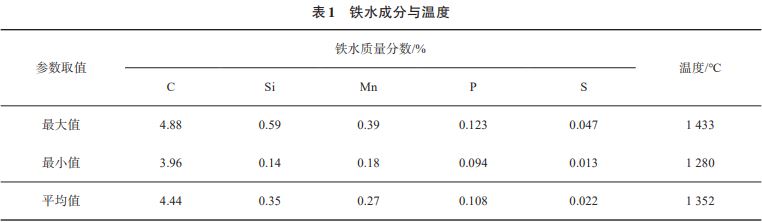 目前,我国铁矿资源日益贫乏,进口矿石成本不断增加,大部分钢铁企业的铁水供应一直是生产的限制性环节。同时,国内机械、车辆、轨道、建筑等行业产生大量的废钢,且废钢的产量也在逐步增加。基于此,国内各钢铁企业对开发低铁耗、高废钢比的低成本转炉生产新工艺进行了诸多探索,最大限度地利用废钢资源,以解决铁水供应不足的问题。河北敬业钢铁有限公司通过调整钢铁料结构、优化炼钢工艺参数等措施,有效降低了生产成本;南京钢铁集团有限责任公司通过优化生产工艺流程和废钢种类,实现了转炉在低铁耗条件下稳定生产,同时减少了碳排放;宣化钢铁集团有限责任公司采取优化氧枪系统、扩大出钢口直径等手段,缩短了冶炼周期,实现低铁耗的快节奏生产;马鞍山钢铁股份有限公司通过物料平衡与热平衡计算,并结合现场试验研究,对操作工艺不断进行优化与改进,如调整铁水、生铁及废钢的装入量,实现转炉终点低成本精准控制;首钢集团及长治钢铁有限公司等采用炉内补热、降低出钢温度等方式,将铁耗降低至 845.04 kg/t,废钢比提高至20.65%;邯郸钢铁集团有限责任公司通过铁包加压块、改变炉料结构、转炉内预热废钢等措施,降低铁水消耗至 870 kg/t。综上所述,各钢厂通过调整钢铁料结构、优化工艺等操作,在降低了铁耗的同时,生产效率也得到明显提高。但有关低铁耗工艺对渣料消耗、终渣成分以及终点磷含量影响的研究鲜有报道。本文对宝武集团鄂城钢铁有限公司(简称鄂钢,下同)炼钢厂 130 t 转炉低铁耗生产进行研究,通过与常规铁耗生产模式各项指标进行对比,分析讨论了低铁耗工艺对渣料消耗、终渣成分以及终点磷含量的影响。