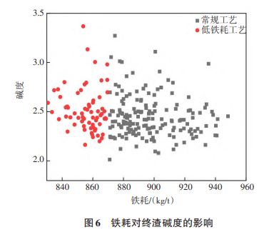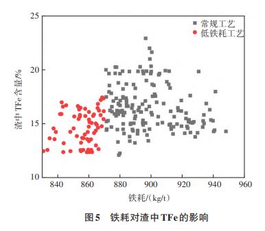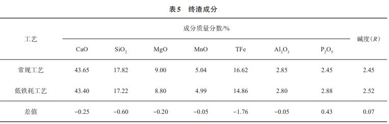 低铁耗工艺与常规工艺的终渣成分对比如表5所列。低铁耗工艺条件下,终渣中的TFe(铁元素的含量)变化较显著,降低了1.76%;由于出钢温度的降低,有效抑制转炉后期回磷现象发生,终渣中P2O5含量增加;终渣中的MgO、MnO含量及碱度变化较小。