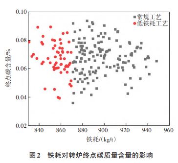 2)两种工艺的终点碳含量都集中在 0.05%~0.08%之间,说明铁耗的变化对转炉终点碳含量影响较小。
