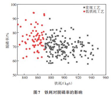 3.4 低铁耗工艺对脱磷率和终点磷的影响
