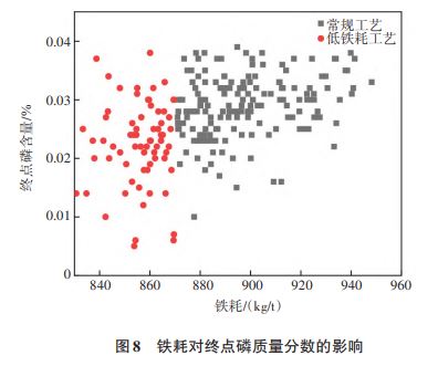 在低铁耗工艺条件下,前期造渣过程中有效提高了渣料的利用率,增强了炉渣去磷效果;在冶炼后期,钢水温度低于常规工艺钢水温度,有效抑制了回磷现象发生。
