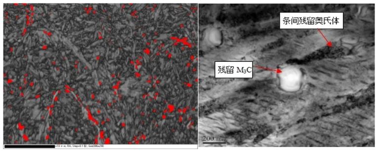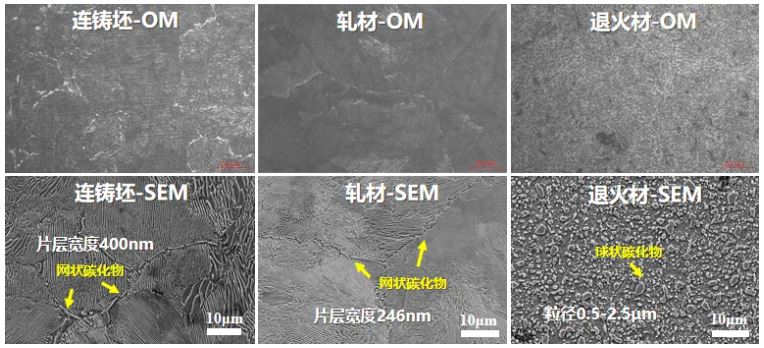 研究解析了不同热处理温度时间和不同生产工序下铸坯微观组织的变化规律。研究表明,随保温时间延长,越多的碳化物溶于基体,同时也捕捉到微观组织存在不均匀现象;连铸坯、轧材、退火材对应的碳化物形貌分别为片层渗碳体(片层间距400nm)、片层渗碳体(片层间距246nm)、球状碳化物(直径0.5-2.5μm)(图3),因此生产工艺参数精准调控和合理匹配是轴承钢微观相组织定量精细控制的关键要素。