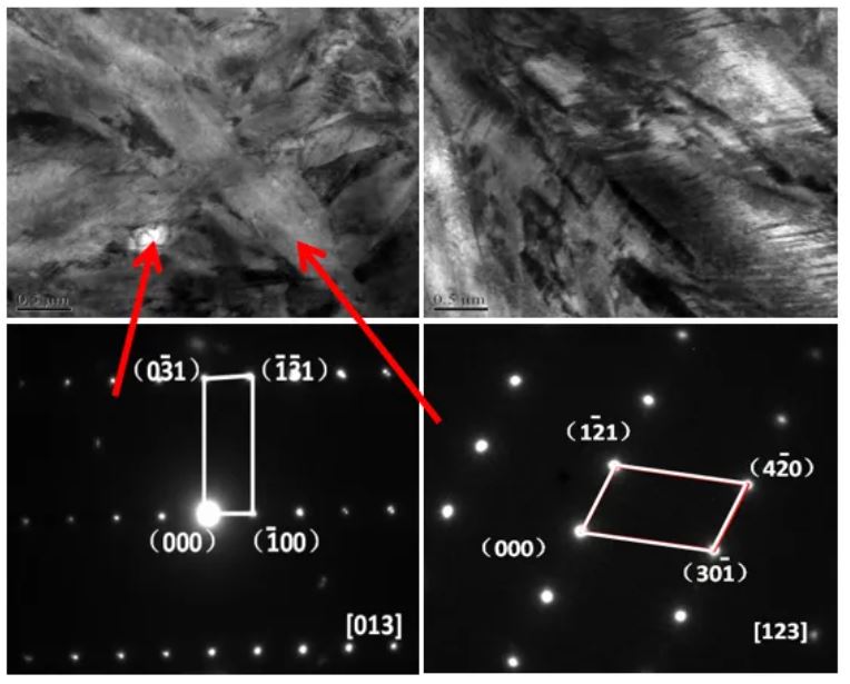 研究结果表明,GCr15轴承钢经淬火、回火热处理,基体马氏体针之间互不平行,呈一定角度,晶粒大小不均;马氏体针内存在大量的孪晶亚结构将成为回火过程中碳原子聚集和析出部位(图8)。
