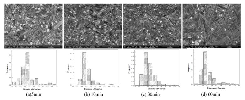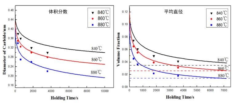 基于已有技术成果理论,定量表征保温过程中相组成的演变规律。研究表明,同一温度下,随保温时间的延长,碳化物比例逐渐降低,且尺寸小的碳化物出现的频率越来越高;同一保温时间下,加热温度越高,碳化物体积及粒子尺寸越小(图6)。