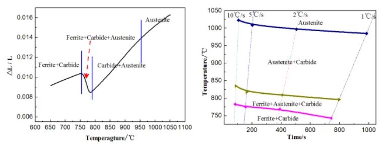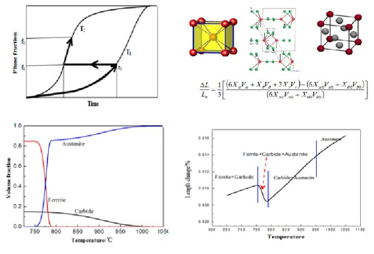研究测定了加热奥氏体化过程热膨胀曲线,绘制出时间-温度的奥氏体化图(图4)。研究表明,当加热速率不同时,各相的转变开始温度不同,相转变温度区间有显著的变化。通过原子层面晶体结构解析模型和数学模型(图5)完成加热相变过程定量解析。