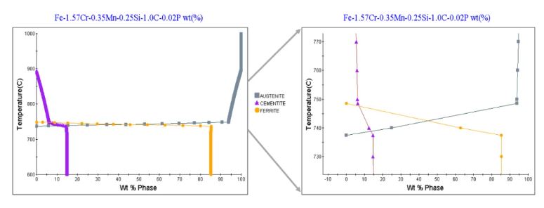 运用J-Mat pro热力学软件,绘制出轴承钢的相图。温度升高至750℃时,基体开始发生奥氏体化,溶碳能力骤增,碳化物开始溶解(图2)。