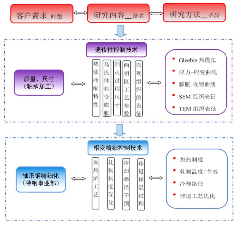 基于用户对轴承(钢)产品加工过程尺寸稳定性、尺寸精度和疲劳性能的综合要求,从全流程角度对基体组织、残余奥氏体和碳化物进行精确定量控制,揭示其组织遗传性规律,实现残余奥氏体稳定性提升及组织遗传性的定量控制,明确加工过程微观相演变(包括球状碳化物、残余奥氏体含量与状态等)与尺寸稳定性和疲劳寿命的关系,提出工艺改进和调控方向,为工业化稳定生产和质量提升提供精确的工艺参数指导,实现全生产链微观相构成和演变的定性/定量控制,促进高品质、高尺寸稳定性、高疲劳寿命轴承产品的研发及产业化。