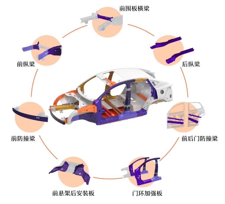 湛江钢铁热镀铝硅热成型材料主要应用于纵梁、保险杠、立柱加强板、地板中通道、车顶加强梁等汽车安全结构件。
