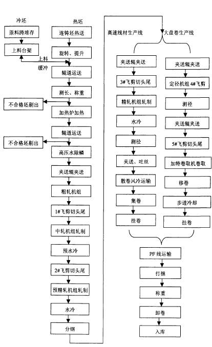 冷床收集装置反映了该线的布置特点,在12架轧机、2#飞剪后,设置大棒冷床及收集装置,主要为生产Φ60mm-Φ130mm的大棒元钢设计;在减定径机组后设3#飞剪,并设置小棒冷床及收集装置。分别配置了2台Φ1800mm热锯机和1台850t纵剪机,作为切断或定尺使用。在两套收集装置内,分别安装了西马克生产的计数器装置。全线的工艺流程见图1。