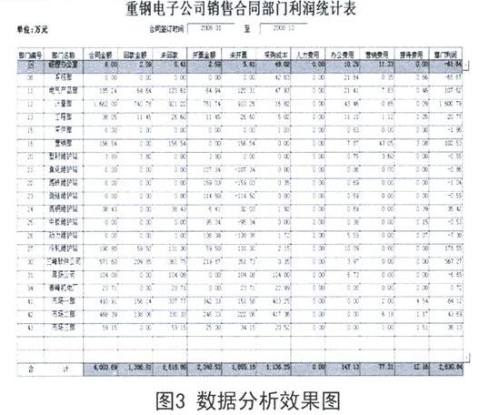 重钢电子企业经营管理控制系统将重钢电子的经营管理过程中各项收支数据整合到一起,并运用良好的数据分析方法将企业各方面的运营指标明细化。企业相关管理人员可以通过系统快速、准确地了解企业当前的各个销售业务合同以及各个方面的实时数据情况,并能详细分析各个方面的细节,摆脱了以往不能明细说明各个盈亏数据细节的状况,能方便快捷的提供了解日常经营的实际情况的数据,为领导层提供实时准确的决策依据。同时采用的数据挖掘方法解决了单单解决企业整合数据的局限,在解决整合数据的基础上,能够将数据进行统计分析,建立企业各方面的数据指标报表,如图3所示。